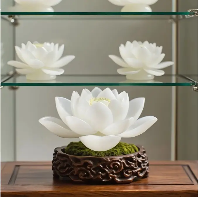 以天然緬甸玉雕琢盛開蓮花,象徵佛教純潔與覺悟。蓮心鑲嵌銅製六字真言,靜置案頭或佩戴皆可淨化負能量,助修行者保持心境澄明。